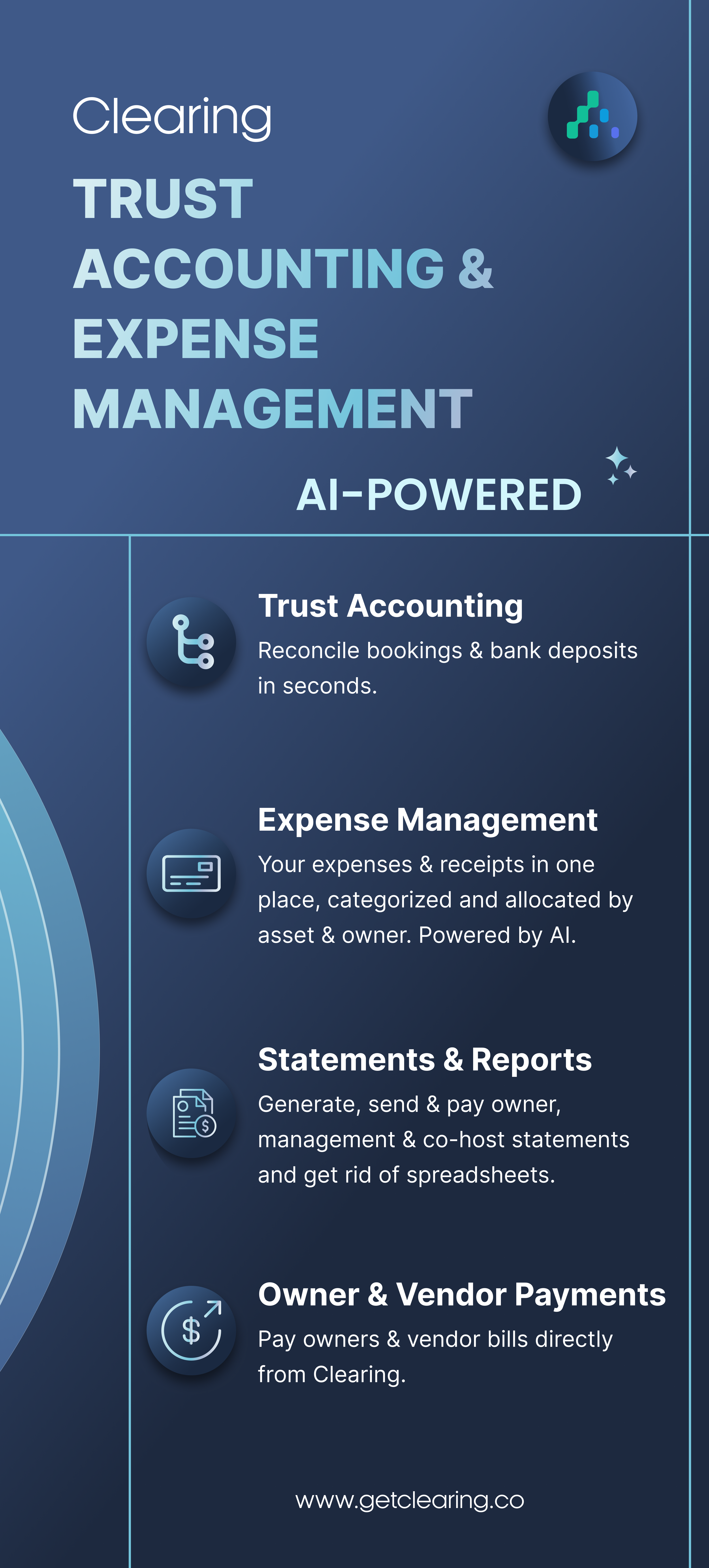 Clearing is an AI-powered trust accounting and bookkeeping automation platform built for Short-Term Rental operators. Property managers use Clearing to reconcile reservation revenue, streamline expense management, and generate clean owner, management, and cohost financial statements - closing their books faster with full financial clarity.