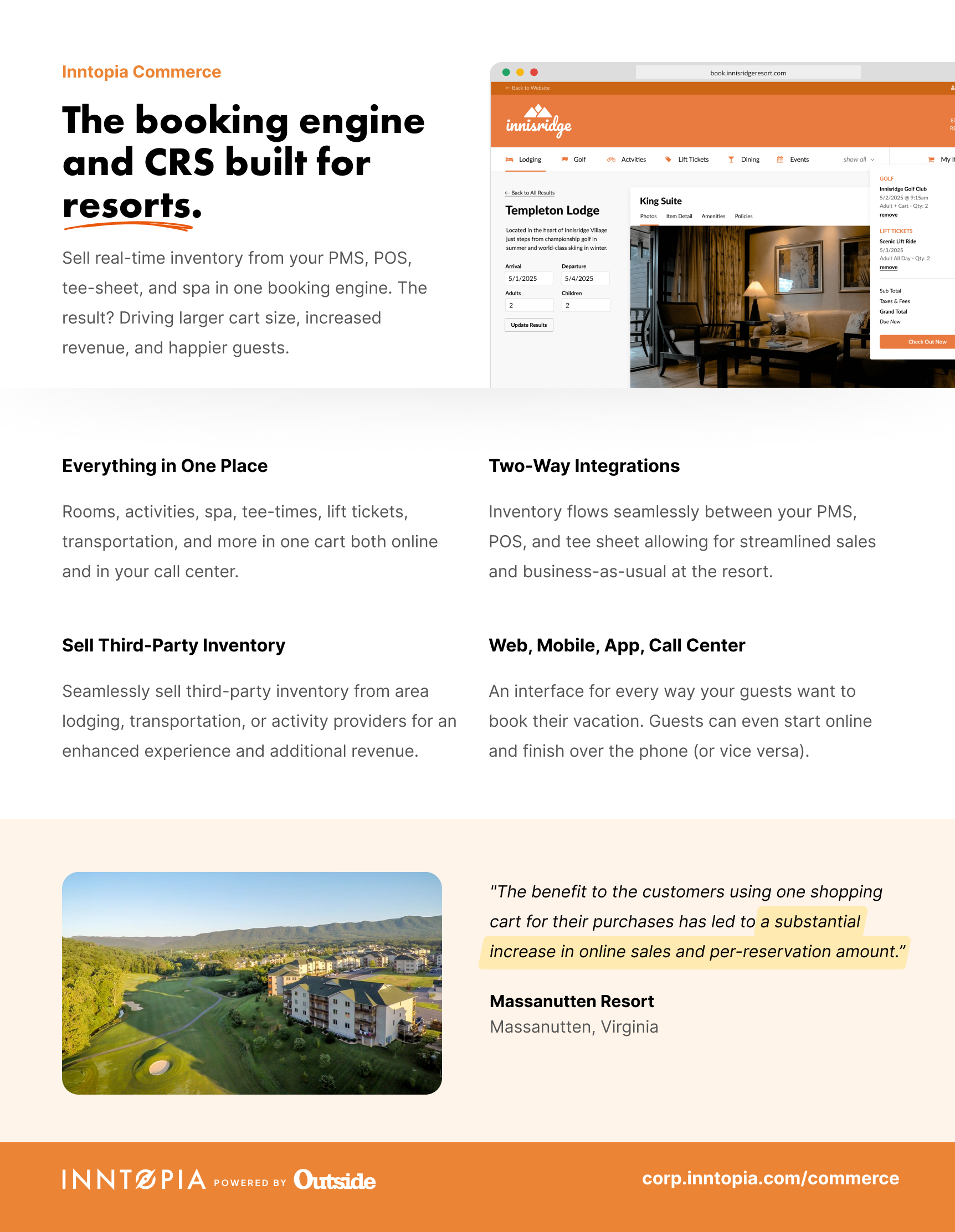 Inntopia helps resorts sell all their experiences in a single booking engine. With two-way integrations to dozens of PMS, POS, tee-sheet, and activity platforms, Inntopia’s one-cart technology creates larger itinerary sizes and better conversion rates for the resort and a smoother, less-stressful booking process for the guest. Founded in 2001, many of the world’s top resorts trust Inntopia to offer their guests a better booking experience including Vail Resorts, Alterra Mountain Company, Sun Valley, and Stein Collection. Inntopia was acquired by Outside Interactive in 2025 to bring booking and marketing functionality to Outside’s audience of more than 100m active users across category-leading brands like Outside Magazine, SKI Magazine, MayMyRun, Pinkbike, and Yoga Journal.