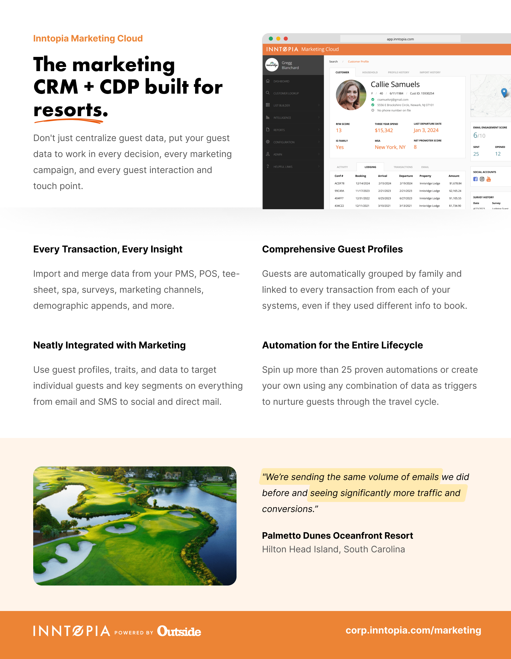 Using omni-channel targeting, Inntopia enables property managers to segment guests based on detailed traits, ensuring that communications through email, SMS, direct, and social channels are personalized and effective.
