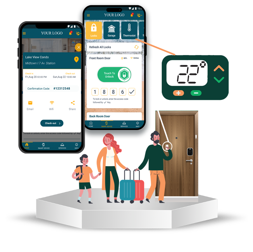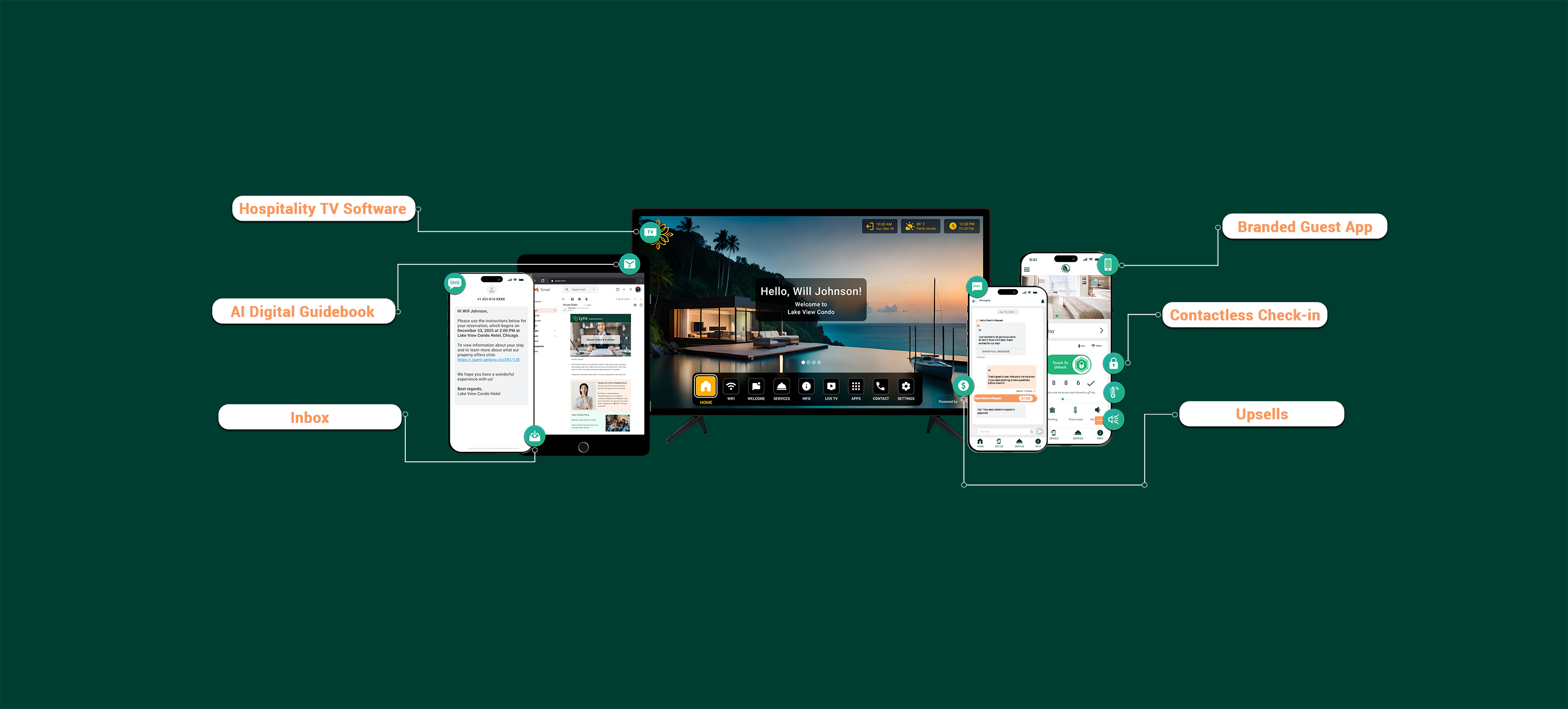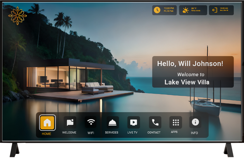 - Smart Hospitality TV Automation: Elevate guest engagement with a branded Smart TV interface, offering Wi-Fi details, upsell opportunities, and guest services directly on the screen.