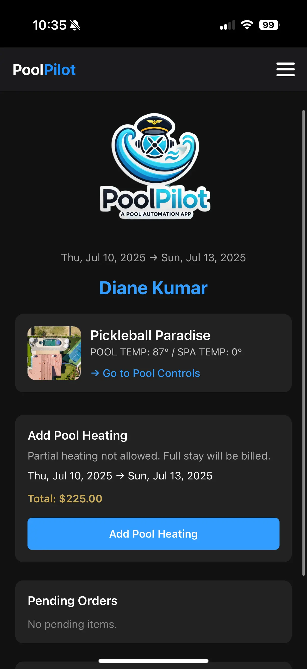 PoolPilot is a tailored solution for short-term rental property managers seeking to optimize pool and spa heating operations. Our platform integrates seamlessly with your property management system to prevent unauthorized usage, automate cost recovery, and reduce energy waste. Backed by real-time control and Stripe-powered payments, PoolPilot supports key systems like Pentair and iAqualink, ensuring a streamlined, professional guest experience without the need for constant manual oversight.